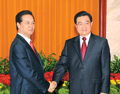 10月22日,國家主席胡錦濤在北京人民大會(huì)堂會(huì)見來華進(jìn)行正式訪問并出席第七屆亞歐首腦會(huì)議的越南總理阮晉勇。