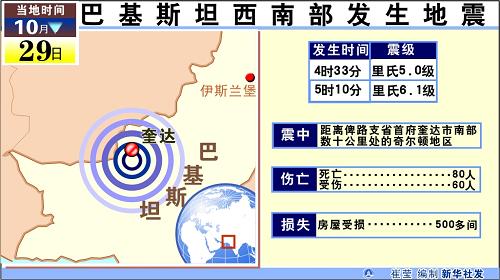 新華網(wǎng)北京10月29日電 國家主席胡錦濤29日就巴基斯坦俾路支省發(fā)生強(qiáng)烈地震造成重大人員傷亡和財產(chǎn)損失,向巴基斯坦總統(tǒng)扎爾達(dá)里致慰問電。