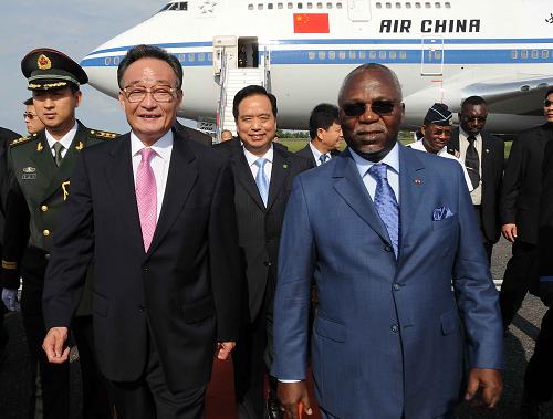 11月6日,全國人大常委會委員長吳邦國抵達(dá)加蓬首都利伯維爾,開始對加蓬進(jìn)行正式友好訪問,加蓬國民議會議長恩達(dá)馬到機(jī)場迎接。新華社記者高潔攝
