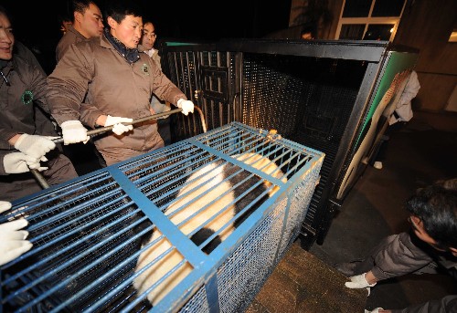 12月23日,工作人員將大熊貓裝籠上車。 新華社記者 陳?ài)?攝