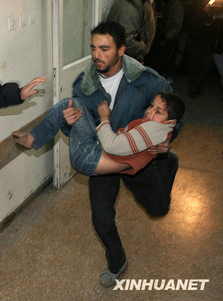12月29日,一名巴勒斯坦男子在加沙地帶將一名受傷的男孩送往醫(yī)院。新華社發(fā)