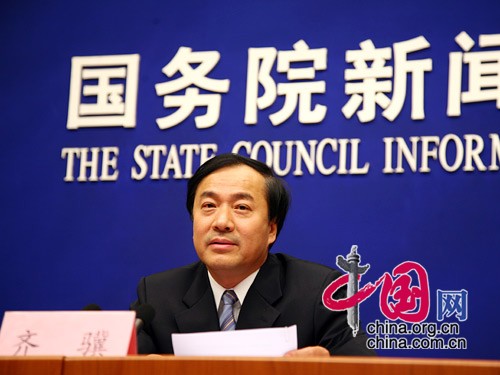 2009年1月6日10時,新聞辦公室舉行新聞發(fā)布會,請住房城鄉(xiāng)建設(shè)部副部長齊驥和發(fā)展改革委、財政部、人民銀行有關(guān)負(fù)責(zé)人介紹關(guān)于促進(jìn)房地產(chǎn)市場健康發(fā)展的有關(guān)情況,并答記者問。圖為住房和城鄉(xiāng)建設(shè)部副部長齊驥介紹情況。