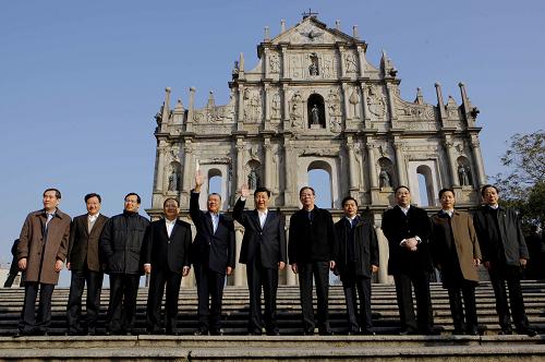 1月11日,國家副主席習(xí)近平到澳門著名文化遺址大三巴參觀。這是參觀后習(xí)近平與澳門特別行政區(qū)行政長官何厚鏵(左五)等合影。新華社記者 周磊 攝