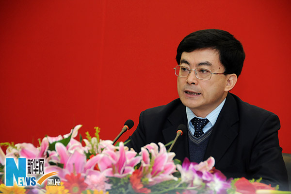 2009年1月15日上午10:30,鐵道部舉行2009年春運第二次新聞發(fā)布會,采取有力措施迎接客流高峰。圖為鐵道部黨組成員、副部長王志國就采取有力措施迎接客流高峰以及當前春運的情況向社會公眾發(fā)布信息。新華網(wǎng) 文濤攝