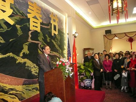 2009年1月17日晚,周文重大使夫婦在中國駐美國大使館舉辦春節(jié)招待會,來自華盛頓市、馬里蘭州、弗吉尼亞州、北卡羅來納州、特拉華州、田納西州等地的華僑華人、中國留學生、香港特區(qū)政府駐華盛頓經(jīng)貿(mào)辦事處工作人員及國內(nèi)常駐機構(gòu)的代表700多人歡聚一堂,共慶佳節(jié)。