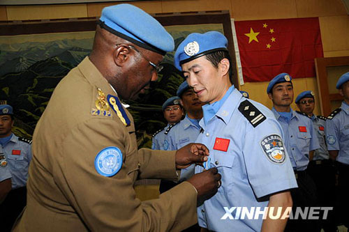 1月15日,在位于蘇丹首都喀土穆的中國駐蘇丹大使館,聯(lián)合國駐蘇丹特派團(tuán)警察部隊(duì)特派員穆諾里亞瓦(左)向中國維和警察頒發(fā)勛章。聯(lián)合國駐蘇丹特派團(tuán)當(dāng)日向中國駐蘇丹維和警察頒發(fā)“聯(lián)合國勛章”,以表彰他們認(rèn)真履行維和使命并做出杰出貢獻(xiàn)。新華社記者邵杰攝