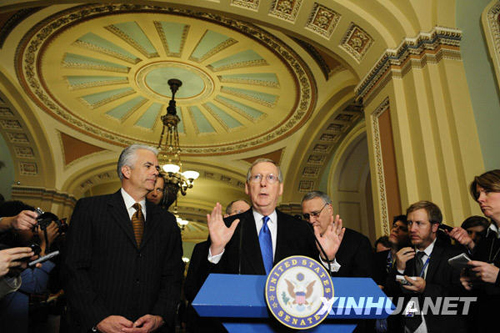 2月10日,美國國會參議院少數(shù)黨領袖麥康奈爾(中)在國會山出席記者會。當日,美國國會參議院在最終投票中以61票對37票的投票結果,批準了總額為8380億美元的經濟刺激計劃。新華社記者張巖攝