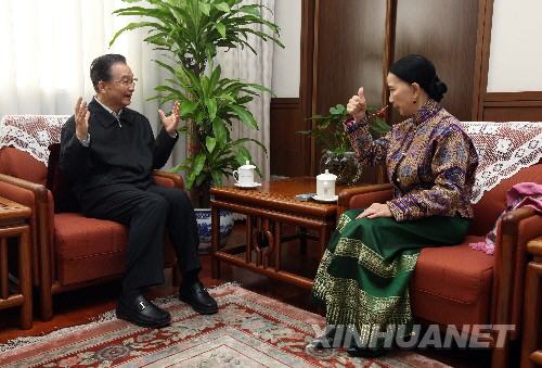 2月14日,國(guó)務(wù)院總理溫家寶邀請(qǐng)著名傣族舞蹈表演藝術(shù)家刀美蘭到中南?偫磙k公室做客,與她一起探討如何更好地傳承和發(fā)揚(yáng)光大少數(shù)民族文化藝術(shù)。(新華社記者姚大偉攝)