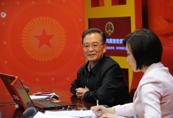 2月28日15時(shí),中共中央政治局常委、國(guó)務(wù)院總理溫家寶與網(wǎng)友在線交流并接受中國(guó)政府網(wǎng)、新華網(wǎng)聯(lián)合專訪。中國(guó)政府網(wǎng)和新華網(wǎng)將全程進(jìn)行文字和視頻直播。圖為溫家寶接受中國(guó)政府網(wǎng)和新華網(wǎng)聯(lián)合訪談,同網(wǎng)民在線交流。新華社記者 李學(xué)仁 攝