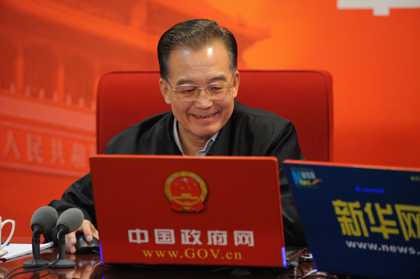 2月28日15時(shí),中共中央政治局常委、國務(wù)院總理溫家寶與網(wǎng)友在線交流并接受中國政府網(wǎng)、新華網(wǎng)聯(lián)合專訪。中國政府網(wǎng)和新華網(wǎng)將全程進(jìn)行文字和視頻直播。 圖為溫家寶瀏覽中國政府網(wǎng)訪談頁面。新華社記者 李學(xué)仁 攝