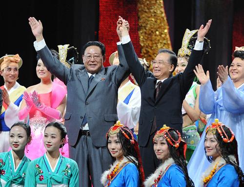 隨后,兩國總理和首都2000余名觀眾共同欣賞了由中國人民解放軍總政治部歌舞團、歌劇團、北京舞蹈學(xué)院,以及朝鮮萬壽臺藝術(shù)團、血海歌劇團和國立民族藝術(shù)團等中朝兩國國家級文藝團體共同演出的“中朝友好年”開幕式演出《友誼頌》。兩國200多位藝術(shù)家的精彩表演博得了現(xiàn)場觀眾陣陣熱烈掌聲。