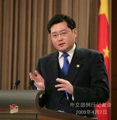 2009年4月2日下午,外交部發(fā)言人秦剛主持例行記者會,就朝鮮半島局勢、二十國集團倫敦金融峰會、中美領導人會晤、中法關(guān)系等回答記者提問。