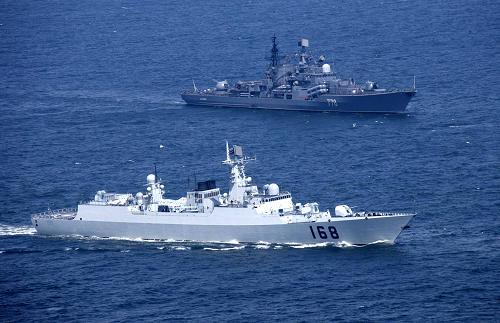 2005年8月23日,中俄海軍導彈驅(qū)逐艦在實施海上協(xié)同。參加“和平使命-2005”中俄聯(lián)合軍事演習的雙方海空軍部隊,經(jīng)過數(shù)天高強度實兵對抗,23日在山東半島東南海域進行海上封鎖作戰(zhàn)演練。