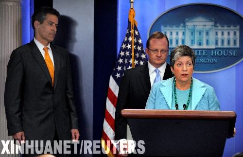 4月26日,在美國首都華盛頓,美國國土安全部長珍妮特·納波利塔諾(右)在新聞吹風(fēng)會(huì)上講話。當(dāng)日,白宮就美國出現(xiàn)人感染豬流感病例舉行新聞吹風(fēng)會(huì),宣布美國豬流感患者增至20人,美進(jìn)入公共衛(wèi)生緊急事態(tài)。美國國土安全部長珍妮特·納波利塔諾、美國疾病控制和預(yù)防中心代理主任理查德·貝塞爾(左)等出席了新聞吹風(fēng)會(huì)。 新華社/路透