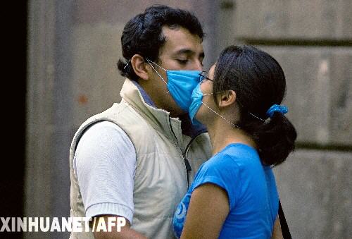 4月25日,在墨西哥首都墨西哥城,一對(duì)情侶戴著口罩接吻。墨西哥衛(wèi)生部官員何塞·科爾多瓦當(dāng)日通報(bào)說,截至24日晚間,墨西哥共有20人直接因感染豬流感病毒死亡,全國疑似病例達(dá)4000余人。 新華社/法新
