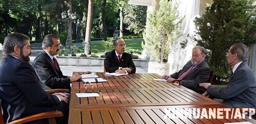 4月29日,墨西哥總統(tǒng)卡爾德龍(中)在墨西哥城總統(tǒng)府召見衛(wèi)生部長科爾多瓦(左二)。墨西哥韋拉克魯斯州政府當(dāng)日證實,墨西哥首例人感染豬流感患者目前已痊愈,恢復(fù)正常生活。(新華社/法新)