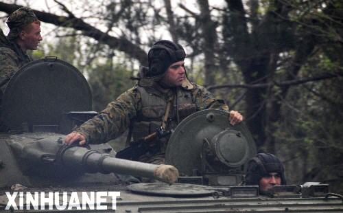 5月5日,在格魯吉亞首都第比利斯附近,格軍坦克向發(fā)生叛亂的穆赫羅瓦尼內(nèi)務(wù)部隊(duì)軍營(yíng)進(jìn)發(fā)。格魯吉亞內(nèi)務(wù)部5日宣布,格強(qiáng)力部門當(dāng)天聯(lián)合挫敗一起由格高級(jí)軍官策劃的軍事叛亂,該叛亂旨在破壞即將于6日舉行的北約軍事演習(xí),并推翻由總統(tǒng)薩卡什維利領(lǐng)導(dǎo)的現(xiàn)政權(quán)。 新華社記者郭群攝