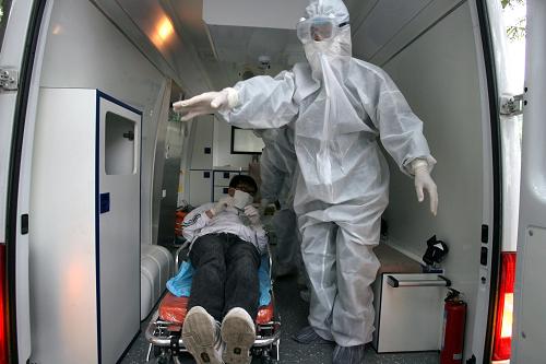 5月13日,山西省運城市舉行防控甲型H1N1流感應急演練,通過發(fā)熱門診對“疑似患者”接診、專家會診、流行病學調查、救治處理、消毒以及應急隔離等環(huán)節(jié)處置,以提高運城市各部門對突發(fā)公共衛(wèi)生事件的應急處置效率和醫(yī)療衛(wèi)生人員的實戰(zhàn)能力。新華社發(fā)(薛俊 攝)