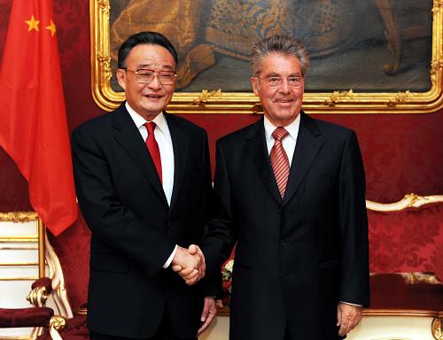 5月15日,正在奧地利進(jìn)行正式友好訪問的全國(guó)人大常委會(huì)委員長(zhǎng)吳邦國(guó)在總統(tǒng)府會(huì)見奧地利總統(tǒng)菲舍爾。新華社記者 李濤 攝