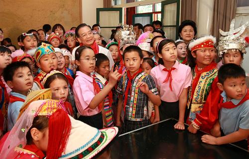 溫家寶認(rèn)真地傾聽,他說:“聽了大家的話十分感動。我們是一個‘大家’,有56個民族,雖然住在天南海北,語言風(fēng)俗不一樣,但都是小伙伴,都是兄弟姐妹。今天大家聚在一起,非常難得。請大家都說說自己來自哪里?”
