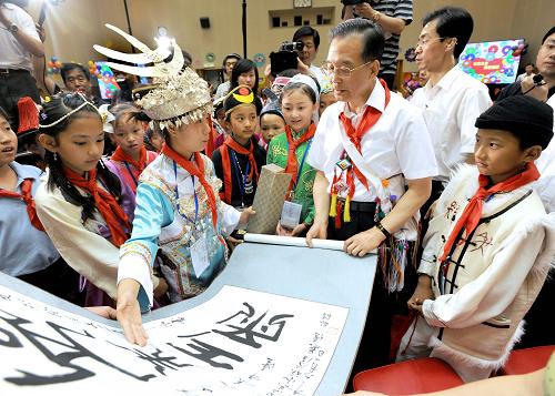 這是一位少數(shù)民族少年兒童向溫家寶贈送書法作品。新華社記者 馬占成 攝