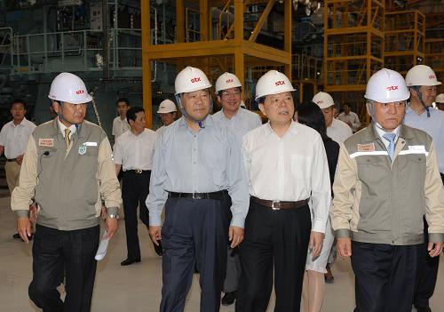 6月11日至15日,中共中央政治局常委、全國(guó)政協(xié)主席賈慶林在遼寧調(diào)研。這是6月12日,賈慶林在大連長(zhǎng)興島臨港工業(yè)區(qū)STX集團(tuán)發(fā)動(dòng)機(jī)工廠視察發(fā)動(dòng)機(jī)生產(chǎn)情況。新華社記者 黃敬文 攝
