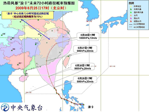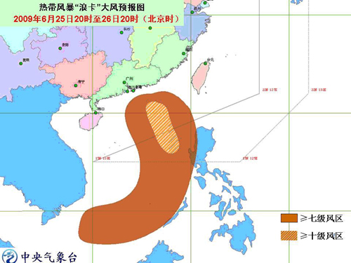 預(yù)計,風(fēng)暴中心將以每小時15-20公里的速度向西北方向移動,以后將轉(zhuǎn)向偏北方向移動,逐漸向廣東中部到福建南部一帶沿海靠近,強(qiáng)度有所加強(qiáng),并有可能于明天夜間到后天白天在這一帶沿海登陸。受“浪卡”和西南季風(fēng)的共同影響,今天晚上到明天白天,南海東部和南部海面將有6-8級大風(fēng),“浪卡”中心經(jīng)過的附近海面的風(fēng)力可達(dá)9-10級。