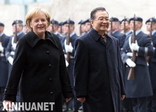 資料圖片:1月29日,德國總理默克爾在柏林總理府舉行儀式,歡迎中國國務(wù)院總理溫家寶訪問德國。