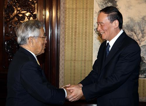 國(guó)務(wù)院副總理王岐山7日在中南海紫光閣會(huì)見(jiàn)日本豐田汽車公司名譽(yù)會(huì)長(zhǎng)豐田章一郎和新任社長(zhǎng)豐田章男。雙方就國(guó)際經(jīng)濟(jì)金融形勢(shì)、中日經(jīng)貿(mào)關(guān)系等交換了意見(jiàn)。
