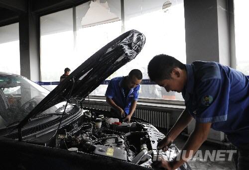 7月15日,新疆通通商貿(mào)公司4S店工作人員在維修客戶送修的汽車。 位于烏魯木齊市天山區(qū)大灣南路的新疆通通商貿(mào)有限公司,在“7·5”事件中損失慘重。近日來,在社會各界和政府部門的關(guān)心和幫助下,新疆通通商貿(mào)有限公司被毀店面已恢復(fù)正常營業(yè)。 新華社記者陳樹根攝