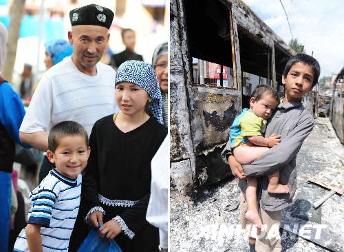 左圖:7月4日,一名男孩和家人在烏魯木齊二道橋逛街。 新華社記者 魯煒攝 右圖:7月6日,在烏魯木齊市北灣街,被大火焚燒的汽車旁,一位少年緊緊抱著一名受到驚嚇的嬰兒。 新華社記者 沙達(dá)提 攝