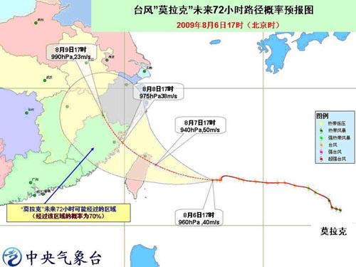 中央氣象臺預計,“莫拉克”將以每小時15公里左右的速度向西偏北方向移動,強度繼續(xù)加強,并逐漸向臺灣東北部一帶沿海靠近,有可能于明天晚上到后天早晨擦過或登陸臺灣東北部沿海地區(qū),然后向福建北部到浙江中部一帶沿?拷
