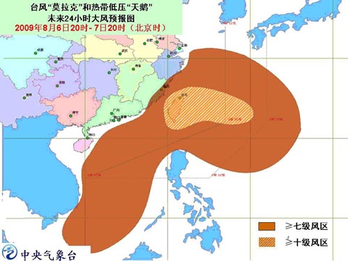 受“莫拉克”影響,今天晚上到明天白天,臺灣以東洋面、東海大部海面、臺灣海峽、巴士海峽、巴林塘海峽、臺灣省及其沿海、福建中北部沿海、浙江沿海將有7~10級大風,“莫拉克”中心經(jīng)過的附近海面的風力有11~15級;浙江東部、福建東北部、臺灣等地有大到暴雨,其中,福建東北部沿海、浙江東南部沿海以及臺灣等地的部分地區(qū)有大暴雨,臺灣東北部的局部地區(qū)有特大暴雨。
