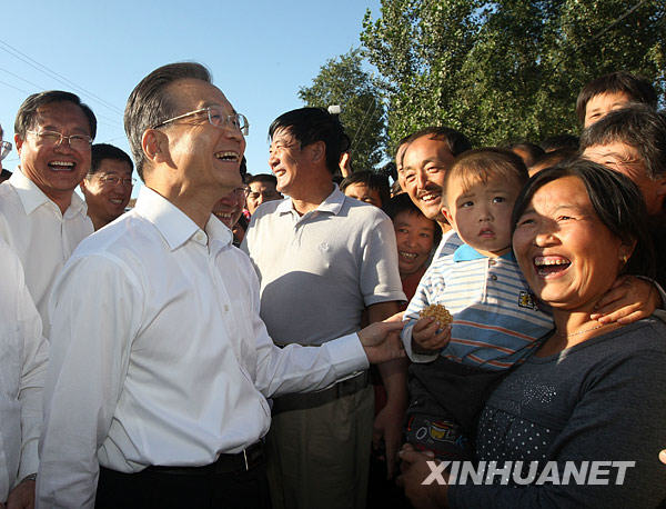 28日至29日,溫家寶來(lái)到內(nèi)蒙古自治區(qū)赤峰市敖漢旗、通遼市奈曼旗,這里旱災(zāi)發(fā)生范圍廣、面積大、程度重。他深入田間地頭,實(shí)地察看農(nóng)作物受災(zāi)和當(dāng)?shù)乜购登闆r,走訪農(nóng)戶,了解人畜飲水和口糧供應(yīng)情況,代表黨中央、國(guó)務(wù)院看望慰問(wèn)災(zāi)區(qū)群眾,檢查指導(dǎo)抗旱救災(zāi)工作。
