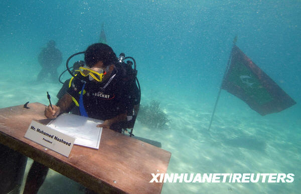 馬爾代夫總統(tǒng)府在一份聲明中說(shuō),納希德和內(nèi)閣其他成員用防水筆簽署了印制在白色塑料板上的決議,這份名為《來(lái)自前線的緊急呼救》的決議將送交今年12月份舉行的哥本哈根聯(lián)合國(guó)氣候變化大會(huì)。