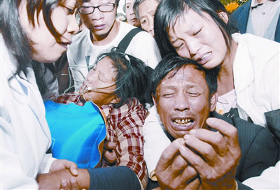 現(xiàn)場,有些失控。工作人員死死拉住陳崇香、涂月熙,并說:“節(jié)哀,節(jié)哀!”突然,傷心欲絕、痛哭中吐不過氣來的涂月熙昏倒在地,正在追悼會大廳負責醫(yī)療的荊州市醫(yī)護人員,趕緊過來給她輸氧搶救。