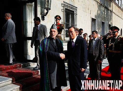 11月2日,阿富汗總統(tǒng)卡爾扎伊(前左)在喀布爾歡迎到訪的聯(lián)合國秘書長潘基文。當(dāng)日,阿富汗獨立選舉委員會宣布,阿總統(tǒng)選舉第二輪投票不再舉行,現(xiàn)任總統(tǒng)卡爾扎伊獲勝當(dāng)選阿總統(tǒng)。新華社/美聯(lián)