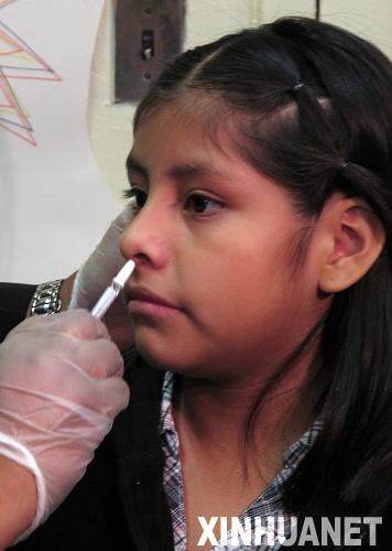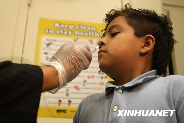 2009年10月28日,在美國紐約布魯克林區(qū)的第157公立小學,一名學生正在接種甲型流感疫苗鼻腔噴劑。新華社記者劉欣攝