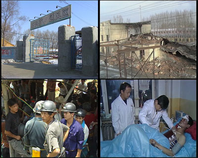 11月21號夜里十點(diǎn),記者趕到了黑龍江省鶴崗市新興煤礦,這里就是礦難發(fā)生的現(xiàn)場,房屋在巨大的外力作用下已經(jīng)全部倒塌,崩裂。雖然距災(zāi)難發(fā)生已經(jīng)過去了二十個(gè)小時(shí),但濃重的水汽仍然從塌陷的地面里不斷涌出,直上藍(lán)天。憑記者目測,幾百平方米范圍內(nèi)的建筑都受到了明顯破壞,斷裂的水泥塊、墻體觸目皆是。知情人透露,這里原本是一處井口,建有十幾米高的樓房,如今已基本被夷為平地,F(xiàn)場空無一人,沒有采取任何防護(hù)和保護(hù)措施。在多方打聽后,在距房屋倒塌現(xiàn)場兩公里左右的地方,記者找到了事故搜救現(xiàn)場,這里是新興煤礦的另一處井口,搶險(xiǎn)和搜救人員從這里進(jìn)入井下實(shí)施搶險(xiǎn)。在井口所處的休息室里,這幾名工作人員正在值班,協(xié)助搶險(xiǎn)搜救工作。