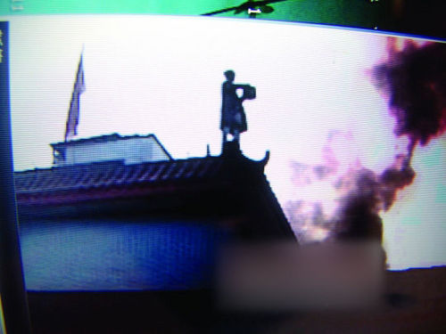 唐福珍站在樓頂自潑汽油前的瞬間。(視頻截圖 來(lái)源:人民網(wǎng))