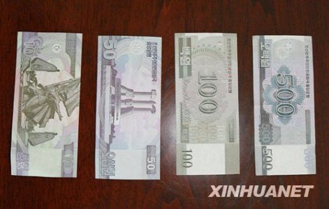朝鮮在11月30日至12月6日更換了貨幣。舊貨幣與新貨幣的兌換率為100比1,即100元舊貨幣兌換為1元新貨幣。新發(fā)行的貨幣紙幣面值分別為5000元、2000元、1000元、500元、200元、100元、50元、10元、5元9種,硬幣有1元、5角、1角、5分、1分5種。新華社記者張濱陽(yáng)攝