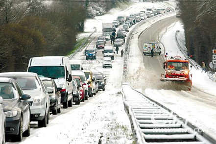 法國西北部積雪阻路,汽車排長龍