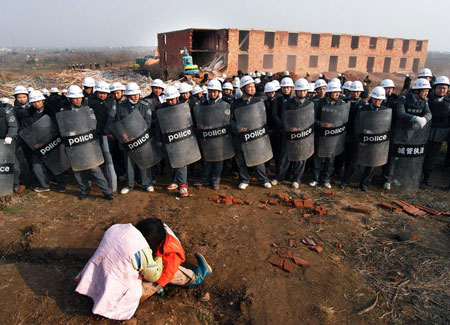 2009年12月17日,武漢市洪山區(qū)公安、城管、規(guī)劃等部門展開聯(lián)合行動,組織800多名執(zhí)法人員強制拆除左嶺鎮(zhèn)3個村近4萬平方米的違章建筑時,遇到了抗拒拆遷的村民,強拆隊伍就用盾牌組成人墻將人隔離在外。