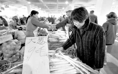 超市里的菜價也是個“漲”字。在沃爾瑪超市宣武門店,馮大爺一邊在蔬菜柜臺前反復(fù)比較著價格,一邊告訴記者,他每過幾天就要到離家不遠的這家大型超市來買東西,感覺蔬菜的價格漲得格外明顯。