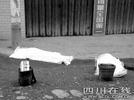 在兩具尸體旁,還可以看到兩個裝滿衛(wèi)生紙等物品的背簍,據(jù)村民介紹說,這是兩名死者當(dāng)天趕集時用的。眾多家屬在旁邊燒著煤炭火在“守夜”,守候著受害者,周圍彌漫著一股悲傷的氛圍。