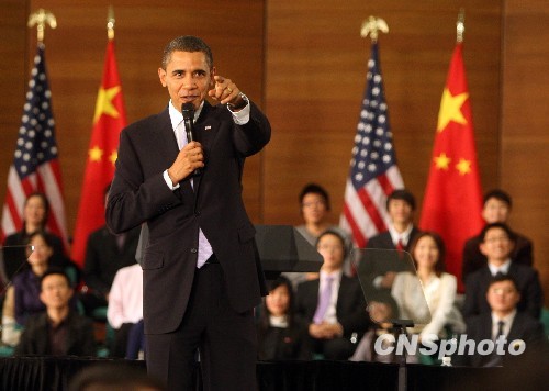 11月16日,正在中國(guó)進(jìn)行國(guó)事訪問(wèn)的美國(guó)總統(tǒng)奧巴馬,在上海就中美關(guān)系的未來(lái)向中國(guó)青年發(fā)表演講并回答提問(wèn)。 中新社發(fā) 湯彥俊 攝