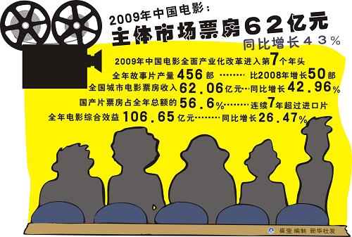 圖表:2009年中國(guó)電影:主體市場(chǎng)票房62億元。新華社發(fā)