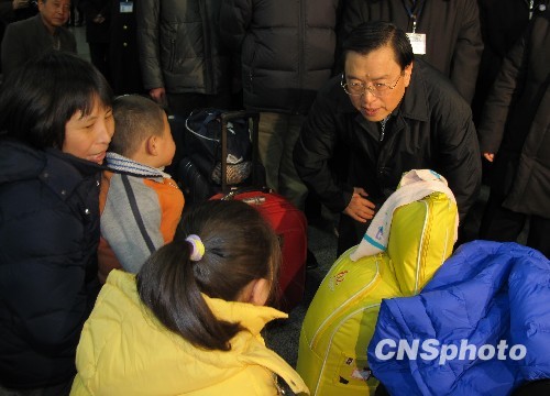 1月26日,中共中央政治局委員、國(guó)務(wù)院副總理張德江在北京西客站與一對(duì)候車準(zhǔn)備回家的豫籍農(nóng)民工一家交談。當(dāng)日,張德江一行抵達(dá)北京西站,視察了應(yīng)急指揮中心,聽取了北京西站春運(yùn)工作匯報(bào),到候車室看望了候車旅客,到售票窗口了解車票發(fā)售情況。 中新社發(fā) 曹巍嵩 攝