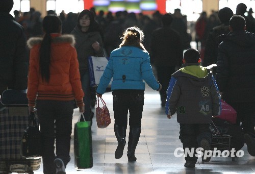 1月21日,一對母子在北京站準(zhǔn)備上車。北京鐵路局根據(jù)北京地區(qū)客流特點宣布,從1月20日起北京鐵路運輸部門進入春運狀態(tài),這比全國春運提前了10天,春運將一直持續(xù)到3月10日。 中新社發(fā) 蘇丹 攝