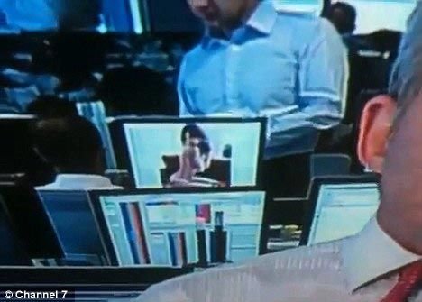 澳大利亞電視七臺2日在麥格理銀行拍攝一期新聞訪談節(jié)目。一名工作人員接受電視臺采訪談?wù)摪拇罄麃喗?jīng)濟時,另一名職員在一旁點開澳大利亞名模米蘭達·克爾一組幾乎全裸照片瀏覽,全然不知自己已成為新聞“背景”。